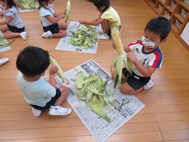 おやつに頂くトウモロコシの皮むきを年中さんがしてくれました。