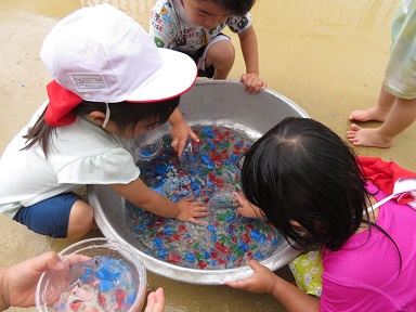 ちゅーりっぷさんは、寒天で遊びました。触ったり切ったり水に浮かべたりカップに入れたりして思い思いに遊びました。