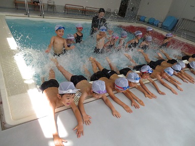 年長さんのプールです。バタ足をしているお友だちに水をかけてます。手と足どっちが水を飛ばせるかな?夢中になって遊んでいるうちに水が飛んでも平気になっていきます。