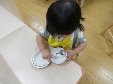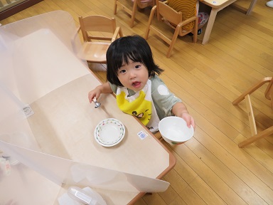 先生の言ったことを理解し、自分でスプーンを使ってご飯を全部食べられ、お茶碗がピカピカになってうれしく感じ、さらに先生に褒められてうれしくて・・・1歳児のお友だちが食事終わりの短い間の中で様々に考えて行動する姿が見られ、感心しました。
