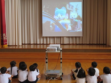 終了後に年中・年長さんは、雨天時の為に用意していたビデオを見ました。ルールちゃんとマナーくんと一緒に交通安全について改めて考えることが出来ました。