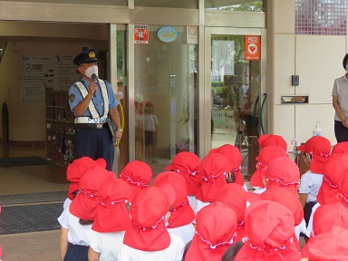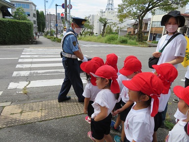 園長先生のお話を聞きした後に、署長さんからお話をお聞きし、①道の端を歩く ②信号は青で渡る ③横断するときは一度止まって左右を確認して手を挙げて渡る ことを約束しました