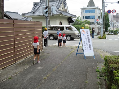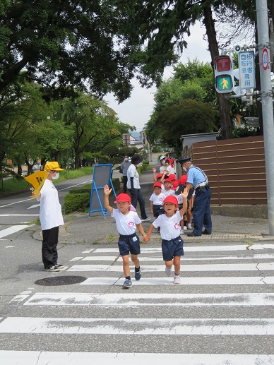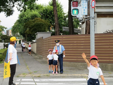 信号を渡る時に署長さんから「青になったらここまで出てきて左右の確認をするんだよ」と教えて頂いています。横断の際には一人一人に丁寧に指導してくださいました。