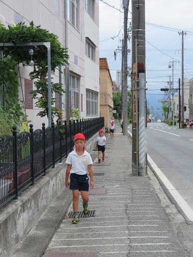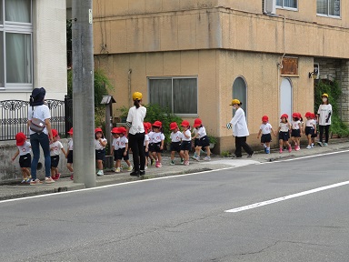 年少さんはクラス毎歩きました。先生の話や笛の音を聞いて皆で安全に歩けるように確認しながら歩きました。