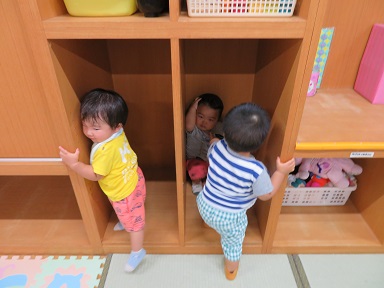 今度はお友だちが棚に入ったのを見て、同じように入ってみたくなったつくしさん。