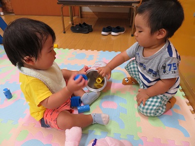 今度はそれを見て真似っこ 同じものを持って同じように遊ぶことが楽しくなってきています。