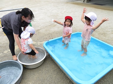 2歳児さんは園庭の簡易プールに足やお尻の消毒をして入って遊びました。少しお湯を足したプールです。「あったかいね」「ワニさんできるよ!」と教えてくれるお友だちもいました。