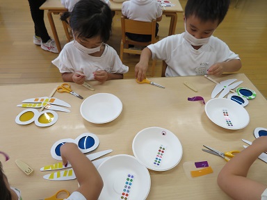 年中では、「とんぼのめがね」にちなんで、赤や青・黄色の目をしたとんぼを作りました。
