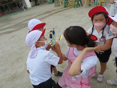 園庭に出てとんぼの目を通して外を見たり、とんぼを飛ばしながら走ったりしていました。