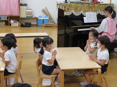 実習の先生と朝の活動をします。落ち着いてお参りをする年少さんです。