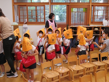 子どもたちは先生の話を聞いて、カバンやリュックを背負って防災クッションを被って園庭に避難する準備をします。