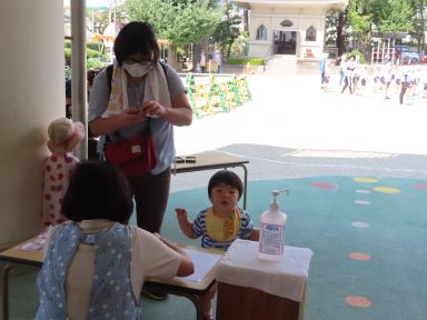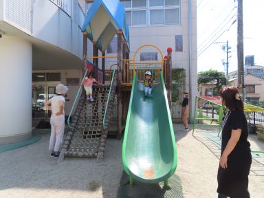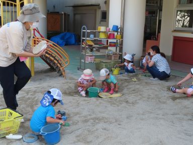 集まったお友だちから、園庭の好きな場所で遊び始めました。やっぱり砂場が魅力的なようで、お母さんと一緒にお山を作ったり、砂をカップに入れることを楽しんだりしているお友だちが多かったですが、すべり台が気に入って、何度も何度も滑っていたお友だちもいました。