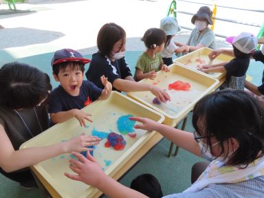 今回の活動は、『色水・片栗粉スライムで遊ぼう』。まずは3色の片栗粉スライムで遊んでみました。警戒心を持ちながらも・・・触ってみたら・・・とっても不思議な感触!お手々がベタベタになるのも構わず、長い時間こねたり・のばしたり・色を混ぜ合わせたりしながら楽しみました。初めて触るものだから、ちょっと最初は戸惑いがありました。でも、お母さんたちが先に触ってどんな感触か伝えたり、お子さんが触れるように上手に促してくれたことで、遊ぶことができましたね!