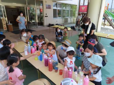 活動の後半には、4食の色水を用意しました。空のペットボトルに好きな色水を小さなカップで注ぎ込んで、色を混ぜ合わせたりしながら美味しそうなジュースをつくりました。なるべくこぼさないように入れようと集中して入れていましたよ!
