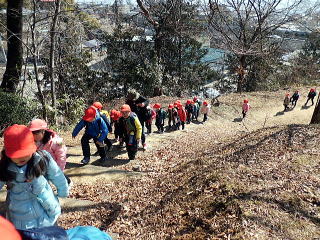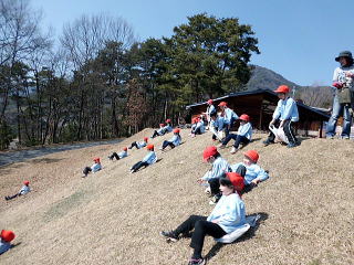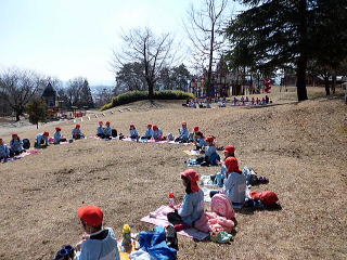 | 3月5日(火)、年長さんがお別れ遠足で、子どもの森公園へ行きました。山道を歩いたり、広い公園で大型遊具で遊んだり、芝滑りを楽しんだり、お弁当を食べたりと楽しい思い出がいっぱいできました。 |