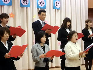 アトラクションはPTAはハンドベルによる運動会のリズムパレードで年長が行った「ビリーブ」の演奏、そして職員は劇と「桜の栞」「旅たちの日に」を歌いました。 |