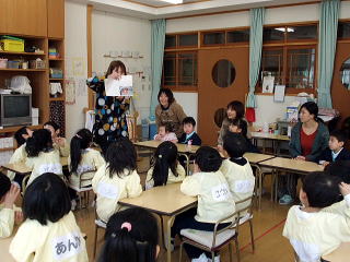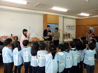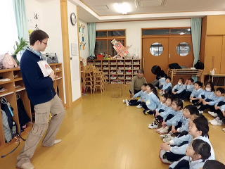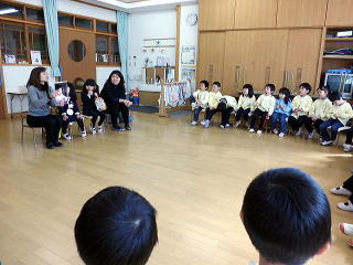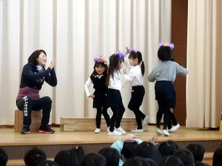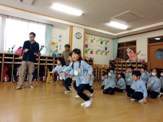 | 年長さんの1年間の「英語を遊ぼう」も終了しました。英語を教えていただいたりゲームを一緒に楽しんだりし、すてきな時間を先生とともに過ごすことができました。 |
