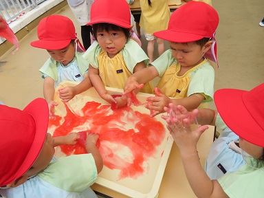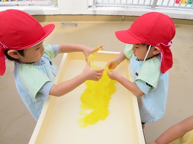 髙松先生が片栗粉でスライムを作って下さいました。始めのうちはおそるおそる触っていた子どもたちも、その感触を楽しみながら夢中になって遊んでいました。色を混ぜたりカップに入れたりしてさらに楽しみました。