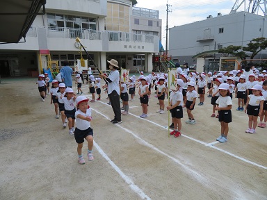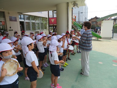 年長さんのリズムパレード、前園長の和子先生にも指導をして頂きました。
