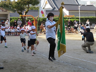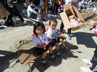 「よういどん」をしたら、キラキラ輝く風車を取って先生の待つゴールに向かいます。