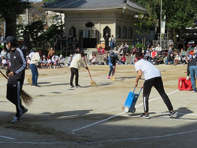 競技の合間には運動会委員のお父さんお母さん方が片付けや準備、ライン消しやライン引きをして下さいます。委員の方々のおかげでスムースに進行出来ます。