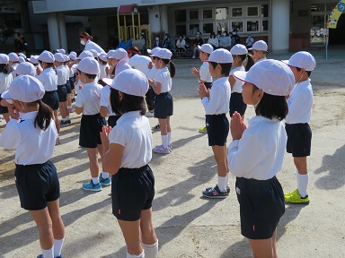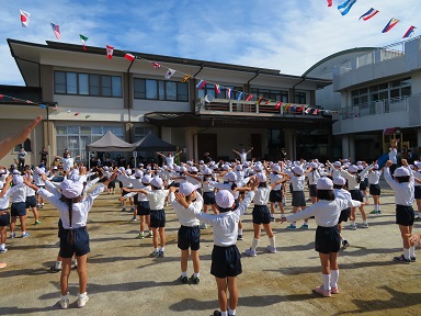 各クラス2列ずつになっての入場・整列は、目印がなくても間隔を取りながら自分たちで並ぶことが出来ました。4列から各クラスで大きな円になる隊形移動も上手にできました。