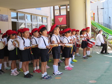最後は園舎前に整列して終了。さすが年長さんです。自信を持って立派に演奏出来ました。お客さんから大きな拍手を頂きました。