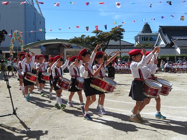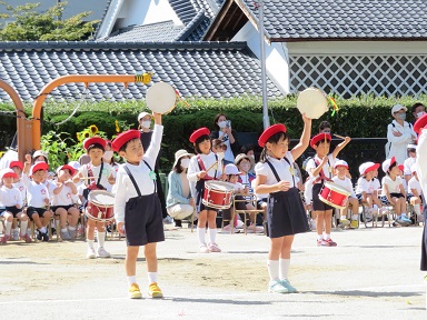 「イッツアスモールワールド」の音楽に合わせて入場してきました。楽器を打ちながら間隔を保って歩くことはとても難しかったのですが毎日の積み重ねで出来るようになってきました。