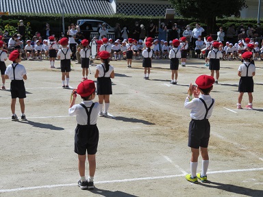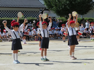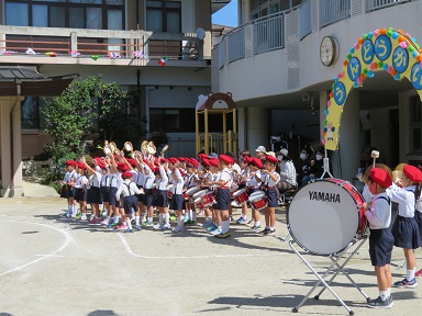 園庭に並びました。「崖の上のポニョ」を堂々と演奏します。途中で隊形移動をしたり後ろのお客さんにも見て頂けるように後ろも向いて演奏します。