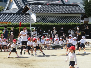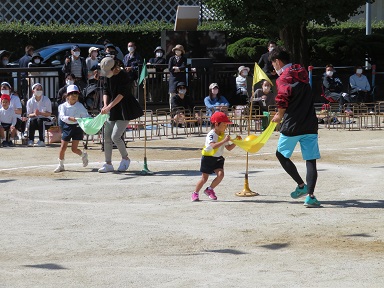 年中さんの親子競技です。各クラス赤・白に分かれた4つのチームでリレーをします。お宝に見立てたボールを乗せたタオルがバトンです。途中にある旗の周りを1周回ります。息を合わせて慎重に運びました。リレーをはじめて知り、チームの応援をしたり勝ち負けを喜んだり悔しがったりする姿も見られました。