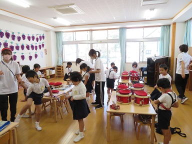 つなひきが終わると年長さんはすぐにリズムパレードの準備に向かいます。制服に着替えをして楽器を持ち、ベレー帽をかぶります。