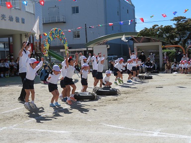 年少さんの時から憧れていたねずみの力くらべ。今年は自分たちの番です。赤ねずみと白ねずみになった子どもたちが大きなタイヤのドーナッツを取り合います。