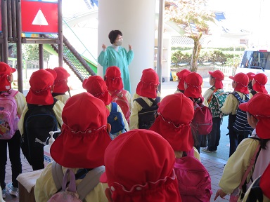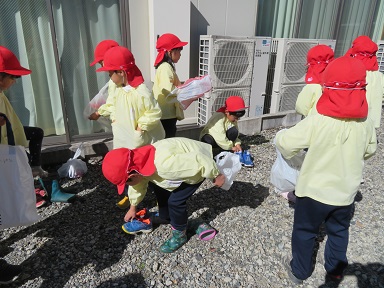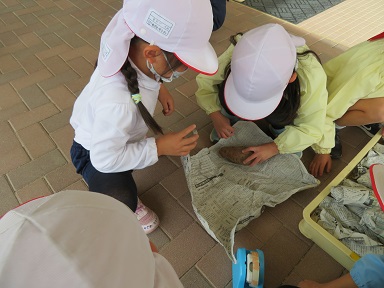 そして翌27日、園で全学年焼き芋をする分を除いても、全園児が持ち帰れるほどのお芋があることが分かり、年長さんが小さいお友だちにあげる分を新聞で包んで各クラスに渡しに行きました。お家でお料理をしてもらってください。「年長さん、ありがとうございました」