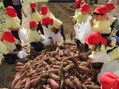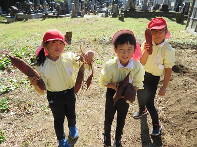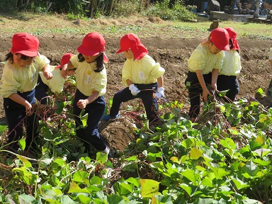 用務員さん2人も畑に行って下さり、お芋を掘ったり掘ったお芋を袋に入れたりして下さいました。