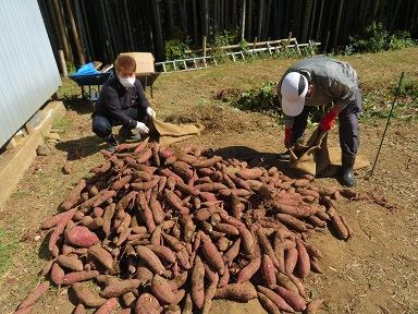 お芋の大きな山になるくらい沢山お芋が掘れました。今年は大きすぎるお芋は少なく、焼き芋にするにはちょうど良い大きさのお芋が沢山とれたかな、と斎藤さん。