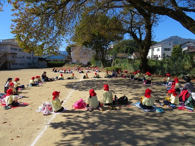 女子高校のグランドをお借りしてお弁当を頂きました。保護者の皆様には、先日の遠足に続いてお弁当の準備ありがとうございました。