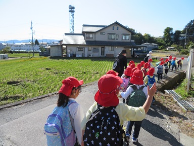 お弁当を頂いて元気をチャージ!お土産のお芋分で重くなったリュックを背負って歩いて帰ります。「疲れた」と言いながらも園までしっかり歩けました。