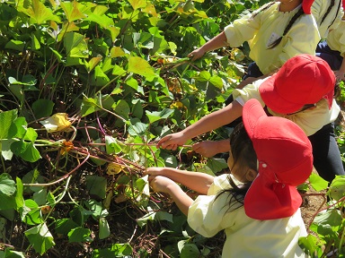 「まだあるかな?」「つるが見えるから、まだここにありそう」まだ土の中にあるお芋を探します。
