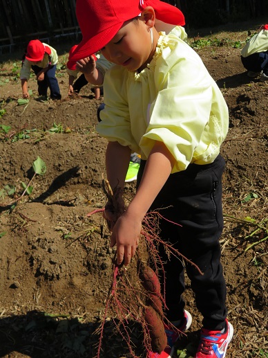 長いお芋や大きなお芋、かわいい小さなお芋も沢山掘れました。畑からは虫やトカゲも出てきて大喜びの子どもたち。