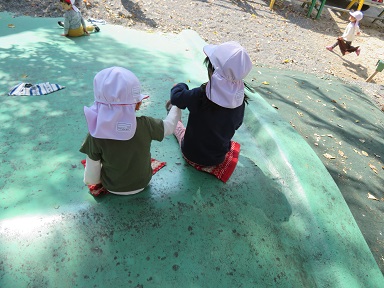 友だちに「一緒にすべろう」と声をかけられて、少しの間考えて(そうだね、一緒に滑れば楽しそう!)の後に「すべろう、すべろう」と手をつないで滑るお友だちがいました。’友だちと一緒だと、もっと楽しいな‘と感じられるようになっている2歳児のお友だちです。