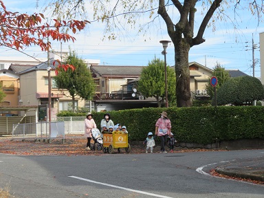園外にお散歩に出かけました。気持ちの良い青空を感じながら、散った葉っぱの上を歩いたりするのも楽しそうでした。