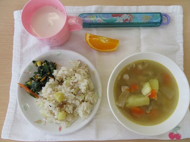 お汁にもご飯にもお芋が沢山! 秋の献立ですね。
