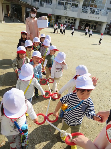 いちごさんはお山のすべり台へ出かけます。誘導ロープにつかまって皆で出かけました。
