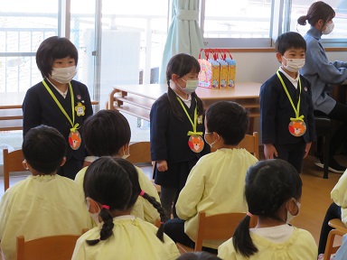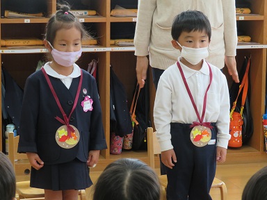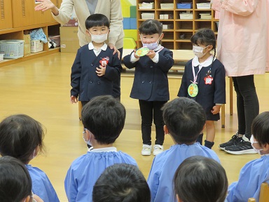 年少さんも3人。園長先生からペンダントをかけて頂いて嬉しそうに見せてくれています。