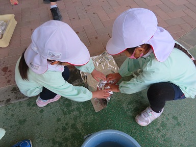 お芋を洗ったり、新聞で包んだお芋を濡らしてホイルで包みます。お友だちと一緒に巻きました。