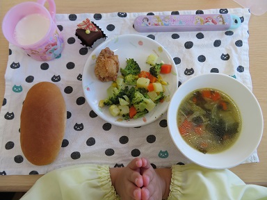誕生会の日の献立です。カラフルですね。ケーキには模様入りチョコレートのプレートがあしらってありました。