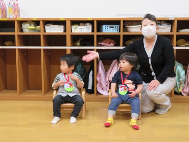 1歳児のたんぽぽさんは2人でした。つくしさんは初めてクラスのお友だちが誕生日を迎えました。
