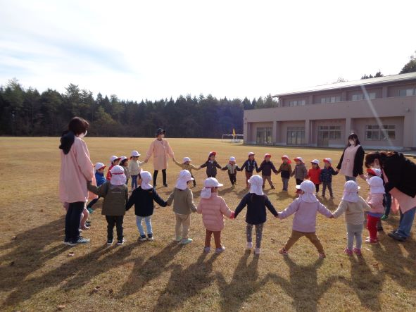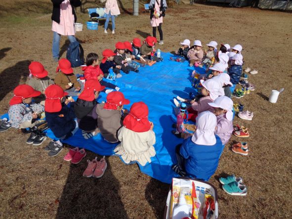 いちごさんとちゅーりっぷさんが一緒におやつを頂き、広いグランドで皆で「あぶくたった」をして遊びました。皆と一緒って楽しいね。