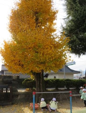 園庭のイチョウがきれいに色付き、散り始めました。一枚の葉でも緑から黄色のグラデーションがきれいです。色や形を見ながら選んで拾う園児の姿が見られました。