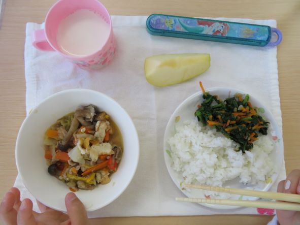献立は、「厚揚げの味噌炒め・ほうれん草のおかか和え・りんご・牛乳」 でした。